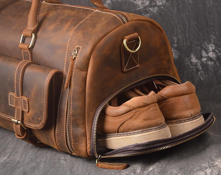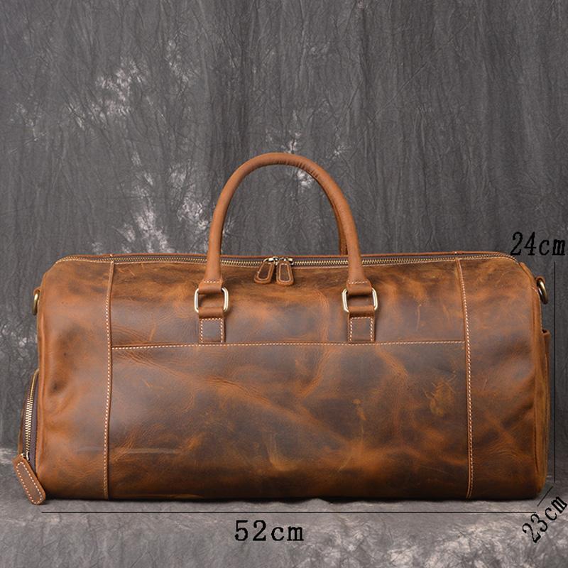 This vintage style leather travel bag combines stylish looking and high quality. It is made of genuine cow leather, which makes it soft and durable. The main compartment has zipper closure, perfect for storing clothes, making it suitable for long time use.